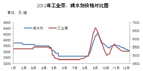 圖2 2012年工業(yè)萘、減水劑價格走勢對比圖