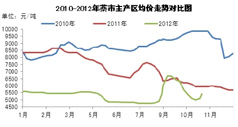 圖1 2010-2012年萘市主產(chǎn)區(qū)價格走勢對比圖
