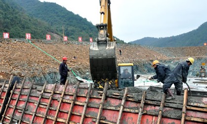 近日,工人在信豐縣五洋水電站工地澆筑混凝土。據(jù)悉,該電站系中型水利樞紐工程,設(shè)計(jì)正常蓄水位141米,總庫(kù)容5930萬(wàn)立方,裝機(jī)容量20兆瓦,建成后年平均發(fā)電量可達(dá)6980萬(wàn)千瓦時(shí)。