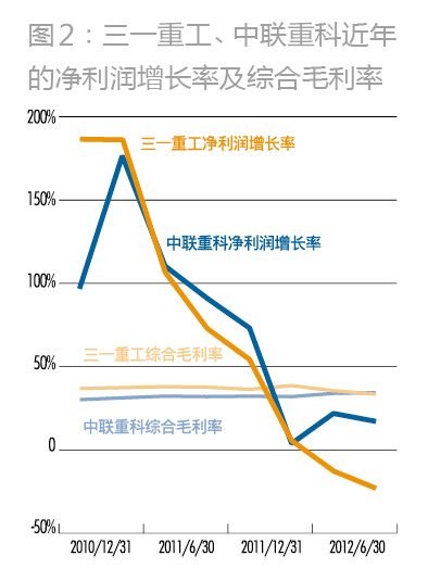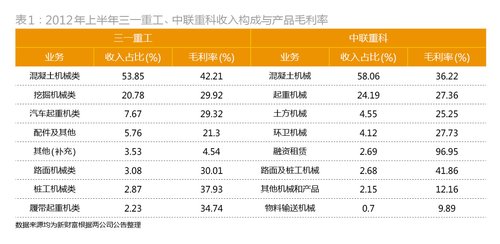 三一重工、中聯(lián)重科,同由長沙成長起來的這兩家企業(yè)不無相似,無論產(chǎn)品結(jié)構(gòu)還是同類型產(chǎn)品的毛利率,都差異不大(表1)。從總營收看,2012年前三季度,三一重工收入407億元,中聯(lián)重科收入391億元,也處于同一量級。