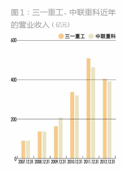 一直在多項經(jīng)營指標上處于領(lǐng)先地位,但在中聯(lián)重科因一系列并購而壯大、因成功于A股增發(fā)和于H股IPO而獲得豐沛資金后,雙方競爭格局開始變化,矛盾也趨于顯性化。從近年雙方經(jīng)營數(shù)據(jù)的變化中,便可一窺端倪。