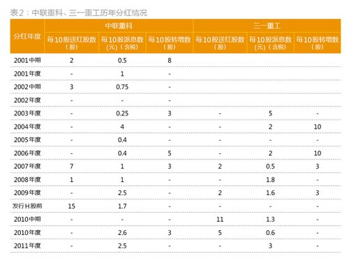 值得贊賞的是,三一重工與中聯(lián)重科都比較重視回報投資者,其上市以來的股利分配政策在A股市場上可謂慷慨,且都重視現(xiàn)金分紅(表2)。