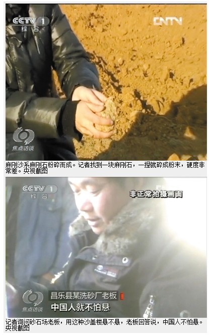 打豬圈都不敢用的沙那得有多不結實?為了徹底搞清麻剛石的品質,記者特意將樣品帶回北京,專家介紹,《普通混凝土用砂石質量及檢驗方法標準》對建筑砂石的規定有十多項,麻剛沙均不符合。