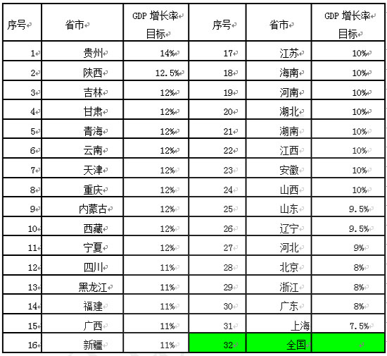 今年GDP預期增長12%,固定資產投資增長30%,社會消費品零售總額增長16%,進出口總額增長8%,公共財政預算收入增長16%,城鎮居民人均可支配收入增長15%,農民人均純收入增長15%,城鎮登記失業率控制在4%以內,人口自然增長率控制在7%。以內,居民消費價格總水平漲幅控制在3.5%左右,單位生產總值能耗和污染物排放完成國家下達的控制指標。