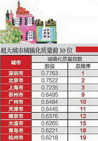 城鎮化質量排名前20位的城市依次為:深圳市、北京市、上海市、克拉瑪依市、佛山市、中山市、東莞市、廈門市、蘇州市、廣州市、天津市、南京市、常州市、無錫市、大連市、東營市、舟山市、青島市、杭州市、烏魯木齊市。深圳市城鎮化質量最高。城鎮化質量排名后10位的城市依次為:烏蘭察布市、臨滄市、懷化市、梧州市、河池市、聊城市、達州市、揭陽市、昭通市、白銀市。烏蘭察布市城鎮化質量排最末位。