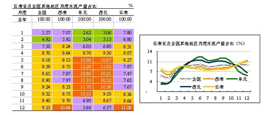常年如春的云南省水泥主機運轉(zhuǎn)率卻和東北、西北地區(qū)差不多,甚至更低,不到60%,東北、西北是季節(jié)原因,生產(chǎn)季節(jié)主要集中在5~10月,而云南省從季節(jié)的產(chǎn)量分布上看相對均勻,運轉(zhuǎn)率低的主要原因是產(chǎn)能過剩。