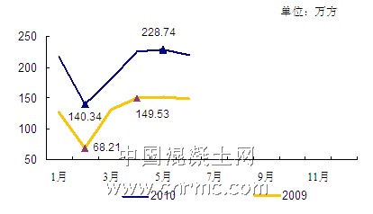 從近幾年該地區(qū)預(yù)拌混凝土產(chǎn)量增長走勢圖來看(見圖二)。2008年、2009年連續(xù)兩年該區(qū)域混凝土產(chǎn)量變化不大,但根據(jù)重慶市混凝土協(xié)會(huì)統(tǒng)計(jì),今年上半年該市預(yù)拌混凝土產(chǎn)量已達(dá)到1210萬方,預(yù)計(jì)全年產(chǎn)量將突破3000萬方。由此,單從產(chǎn)量增長趨勢來看,重慶市混凝土行業(yè)將迎來歷史性的突破。