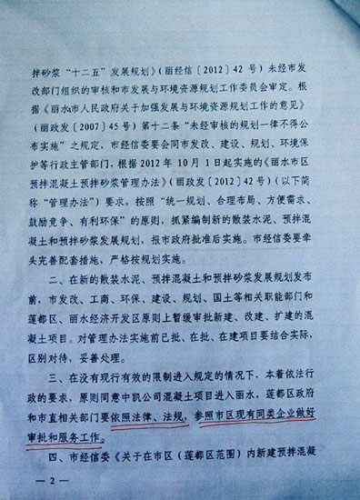 《會議紀要》明確標示:在沒有現行有效的限制進入規定的情況下,本著依法行政的要求,原則同意中凱公司混凝土項目進入麗水,蓮都區政府和市直相關部門要依照法律、法規,參照市區現有同類企業做好審批和服務工作。
