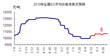 近期,正如砼網所預測,EO的價格在8月上旬持穩(wěn)了一段時間后,在下半月價格出現了反彈。其中,華東地區(qū)的EO價格首先出現反彈,上海化工、三江化工、揚子化工等廠家報每噸EO價格上漲500元左右,價格達到10500元/噸左右,東北地區(qū)則上漲了300元/噸,達到10300元/噸左右,華北地區(qū)的EO價穩(wěn)中攀升至10400元/噸,漲幅也在500元/噸。預計本月將維持其增長速度,到下月其價格可能達到11000元/噸以上。