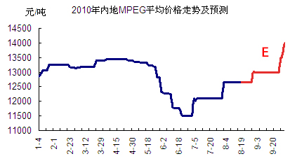 有了EO的價格作為參考,我們可以預測,近期內MPEG的價格也將有一定程度的上揚,如圖二,從圖二我們可以看出,7月伊始,MPEG的價格已開始從谷底緩慢上升,現加之原材料EO價格的上升,有理由相信MPEG的價格下半年將會突破14000元/噸。