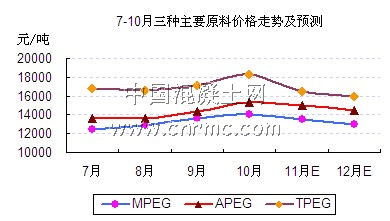 目前,國內市場上出現的羧酸減水劑母液一般以聚乙二醇單甲醚(MPEG)、烯丙基聚乙二醇(APEG)、甲基希基聚氧乙烯(TPEG)三種主要原料不同技術路線合成。MPEG由于受到主要原料環氧乙烷(EO)國內高價的影響,利潤不斷削薄,主要生產廠家奧克、臺界、科隆、皇馬基本無力生產MPEG,而轉向其他原料的技術路線,來取代MPEG的生產;其中科隆減少了原材料供應,進而轉為母液和成品的生產,這也在一定程度上縮減了MPEG的市場供應;同時,一向需要進口的MPEG,由于主要來源:韓國湖石化、美國亨斯邁、日本清木油脂和臺灣東聯等企業10月份普遍缺貨,也導致國內MPEG進口量大減,市場供應不足。對于改性聚醚TPEG,中國混凝土網CEO王驊近期曾指出,由于生產TPEG的起始劑異戊烯醇受日本可樂麗和德國巴斯夫的控制,產品供應和價格波動非常大,除了供應不及時外,價格從年初每噸25000元漲到70000元,生產成本暴漲致使生產企業苦不堪言,由此直接影響TPEG的市場供應。另外,APEG同樣受環氧乙烷價格的影響,市場供應吃緊。近期,由于以上原因,聚羧酸減水劑的三種主要原料價格出現了不同程度的上漲,帶動聚羧酸價格穩步上升。