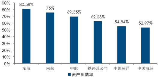 資產負債率對比:中鐵總、三大航、二大海運。數據來源:鐵道部、Bloomberg