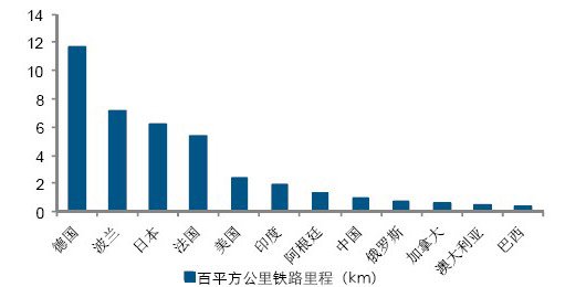 世界主要鐵路大國鐵路路網密度。數據來源:長江證券