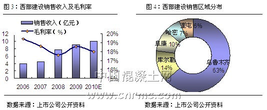 西部建設(002302)作為中國混凝土行業首家以混凝土業務為主營業務上市的西部企業,自上市以來,業內人士多數看好,成為許多欲上市企業或較大混凝土企業的研究對象,尤其是欲進軍混凝土行業的水泥企業更是對其表現出濃厚的興趣。該公司上市一年多來,雖然在股市上表現差強人意,但其作為西部最大的混凝土企業來說,上市的標簽無疑讓其在整個混凝土行業占盡了風頭。預計2010年公司混凝土產量將實現360萬立方米,較去年同期增長23%(見圖1-4)。但由于其主要業務過于集中于烏魯木齊、奎屯、庫爾勒等省內市場,且產品單一,再加上本身混凝土行業受制于原材料的供給,故未來企業還需要尋求更大的發展空間,拓展業務領域,增加與混凝土相關的產品,減少企業運行風險。