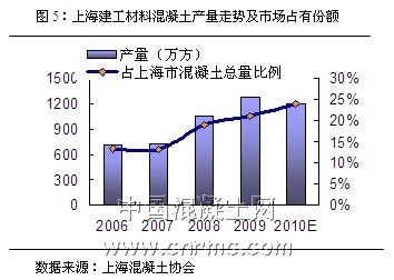 2010年世博會的盛大舉行,該公司混凝土生產受到了很大影響,乃至整個上海市混凝土產量都將大幅下滑,預計2010年該公司混凝土產量達到1200萬立方米左右,市場占有率仍保持在兩成以上(見圖5)。