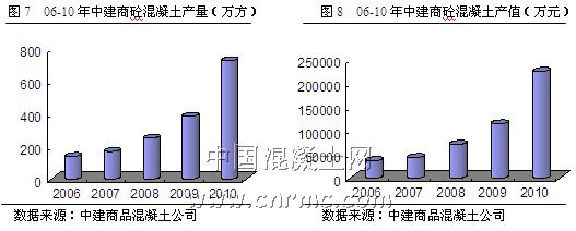 在短短的幾年間,中建商砼已建成22個現代化攪拌站、擁有41條專業生產線,據悉,目前還有幾個拌站正在進行前期的基礎建設,生產規模將不斷擴大,其商品混凝土供應能力是武漢市場100多家同行企業總和,成為華中地區最大的混凝土生產企業。根據企業官方提供數據,2010年中建商砼混凝土產量達725萬立方米,較去年同期增長89%,創歷史新高(見圖7-8)。根據公司“大市場”戰略,到2012年,中建商砼將形成華中、西南、華北三個主力市場,到2015年,該公司將進一步拓展國內外其他市場,形成一體化的區域布局。并計劃5年內商品混凝土銷售覆蓋全國重點區域市場,經營額達到40億元,利潤達到3億元。此外,在技術研究方面,該公司始終走在同行前列,10多項混凝土前沿應用課題研究取得突破,多項技術和成果處于國內領先、國際先進水平。