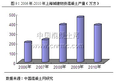 上海城建物資有限公司(以下簡稱“城建物資)是以商品混凝土科研開發、生產銷售為主業的國有獨資企業,注冊資本3436萬元,年銷售總額約6.5億元。公司擁有國家商品混凝土生產最高資質等級——專業承包二級資質,擁有生產各類高標號混凝土、特種混凝土、商品砂漿的技術儲備和能力,生產銷售的全過程受ISO9001質量保證體系控制。公司2010年生產銷售商品混凝土預計為380萬立方米,由于受世博會的影響,下轄多家拌站開工不足,致使混凝土產量同比減少了17%。,但仍是上海地區規模較大的商品混凝土生產企業(見圖9)。