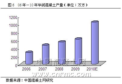 2010年,華潤水泥在華南地區擴張的步伐進一步加劇,6月全面收購環球水泥在中國內地的全部水泥﹑商品混凝土及相關業務;12月又宣布收購廣州市政府、廣州市屬企業越秀集團旗下的水泥及混凝土業務5成股權,以鞏固其在華南地區的市場領導地位,并增加其華南地區的熟料、水泥及混凝土產能。預計今年該公司混凝土產量將超過1000萬立方米,較去年將增長60%(見圖6)。