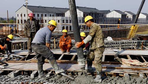 深秋時節寒氣逼人,位于豐南區的津唐運河濱河北大街橋工地上卻是一派熱火朝天的景象。兩臺混凝土高壓泵伸向高高的施工排架,10臺混凝土運輸車往返穿梭,機器的轟鳴聲、混凝土的噴發聲、振搗器的震動聲匯成一部緊張施工的進行曲。從10月20日14:20分,到21日23:00近40個小時連續進行的混凝土澆筑圓滿完成,共澆筑混凝土1400余方。