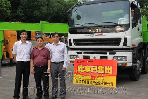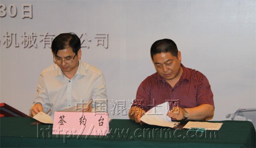 浙江柳鴻機(jī)械總經(jīng)理謝軻(左一)與浙江寶業(yè)總經(jīng)理謝寶金(右一)簽署48M泵車購置合同