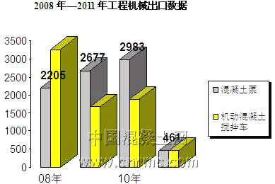 我國機動混凝土攪拌車出口量表現良好,在工程機械中具有領先地位,2008年尤為明顯;其次,由于面臨經濟衰退,我國實施了宏觀調控政策,國際經濟受到震蕩,受到經融風暴的沖擊,2009年的混凝土泵和機動混凝土攪拌車的進出口總數相比有所回落, 但并不影響我國工程機械進出口方面的發展;我國基礎設施建設具有連續性和長期性,工程機械在建筑行業中具有用武之地;2010年的進出口開始慢慢回暖,并且呈現快速增長態勢,對其發展提供了更大更廣闊的空間;截止至2011年1季度,混凝土泵與機動混凝土攪拌車的表現尚算穩定,更加鞏固了我國工程機械行業的國際地位。