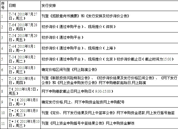 2011年8月5日(T日),在上交所正常交易時間內(nèi)(上午9:30至11:30,下午13:00至15:00)進行。如遇重大突發(fā)事件或不可抗力因素影響本次發(fā)行,則按申購當日通知辦理。