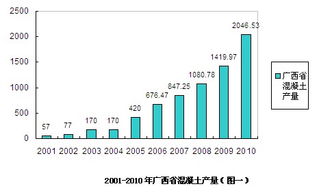 從圖一中可以看出,廣西省2005年—2010年的混凝土產量走勢為逐年遞增趨勢。開始呈現出階梯型增長狀態。從國家“十一五”計劃開始實施期間,廣西省混凝土又開始邁入一個新的發展階段,2006年到2010年的混凝土數據開始由幾百萬方增長值一千多萬方(如圖一),甚至在2010年達到2046.53萬方。十年間,從僅僅只有57萬方增長到現在的2064.53萬方,這些數據見證著廣西省混凝土行業以及城市建設的成長過程。