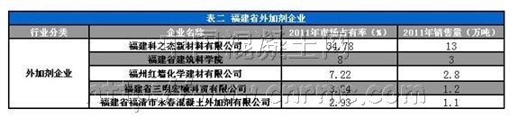 福建省建筑科學院外加劑廠:福建省建筑科學研究院成立于1958年,是福建省建筑工程系統中技術實力雄厚,裝備先進,專業設置齊全,成果轉化迅速的綜合性研究開發與技術服務機構。1998年至2008年承擔省級重大重點項目共18項在新型建材產品研發方面,也時有新亮點,開發出的新一代聚羧酸類外加劑產品不僅大量應用于現澆混凝土、鋼筋混凝土、預應力鋼筋混凝土、泵送混凝土中,并可配制高強、超高強、高抗滲、早強、自流平及鋼纖維等特種混凝土,積極推動了福建省砼施工技術的進步。2011年福建省建筑科學研究院外加劑廠在福建省混凝土減水劑市場占有率達到8%,福建外加劑銷售額第二,預計2011年全年銷量為3萬噸。