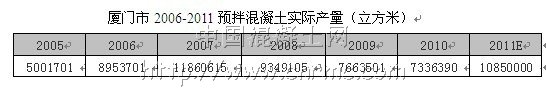廈門市是與深圳市齊頭并進的城市,是全國5個計劃單列市之一。廈門的混凝土行業無論是從行業發展還是從市場管理在福建省都是屈指可數的。廈門混凝土經過2008-2010年3年下滑,2011年又迎來了一個建設高潮,開發海西的國家政策推動功不可沒!