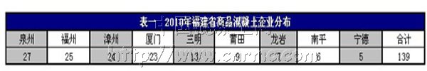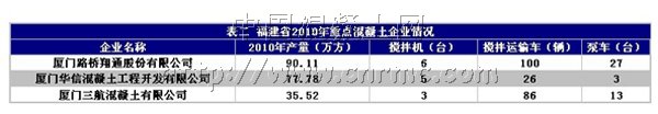 在“十一五”期間,福建省混凝土企業個數也迅速增加,2006年,全省混凝土企業僅為39家,而至2010年,據不完全統計福建省混凝土企業已達139家,年產量3500萬方。福建省新建83家商品混凝土攪拌站;混凝土攪拌車總量達2938輛,混凝土泵車492輛。從以上數據充分,福建省混凝土市場正處于合理增長態勢。 (2010年福建省商品混凝土企業分布,見表一)