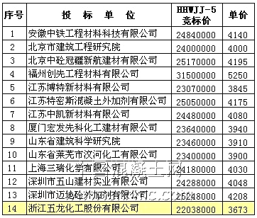 新建上海至杭州客運專線HHWJJ-5標段減水劑投標及各單位競標價