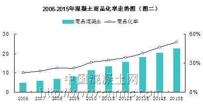 首先,近年來我國商品混凝土增長率呈上升趨勢(如圖一),尤其是在2010年,我國商品混凝土產量增長率達到近年來的頂峰,同比增長43.4個百分點。由于各地城市化建設趨于飽和,而落后地區的建設資金不足,預計十二五期間商品混凝土增速有所放緩,但混凝土產量仍將保持增長。另一方面全國不斷推廣禁現政策,推行混凝土商品化,商品混凝土將成為行業的主流趨勢,混凝土商品化率正在逐年提高,十一五期間,商品化率已提高11個百分點,增長十分顯著,但與發達國家相比仍比較落后,所以我國的商品混凝土仍有很大的提升空間(見圖二)。
