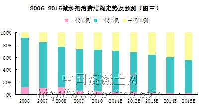 第四,混凝土行業之所以發展能夠如此迅速,正是因為減水劑在該行業中的出現。“十一五”計劃實施期間,減水劑產量增速十分明顯,尤其是第三代減水劑產量增長速度尤為突出。但由于減水劑目前還處在應用拓展的階段,所以增速并不是十分穩定。2008-2010年,由于宏觀調控政策,房地產開發投資、水泥、商品混凝土產量增速的不穩定性而造成減水劑產量增速有所波動以及小幅度的下滑,但并沒有影響減水劑行業在混凝土市場中的重要地位。