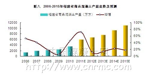 如圖八所示,在國家大力開發海西經濟帶的推動下,2010年福建省商品混凝土產量已經到了3500萬方,較09年同比增長45.83%。在全國混凝土市場占有率也達到了3%,雖然福建省在全國混凝土市場占有率遠不及山東等地,但單從產量的增長速度,卻可以明確看出福建的混凝土市場的前景明朗。以上無論是固定資產的增長,還是房地產投資的力度都可以體現了福建的混凝土市場即將進入一波新的建設高潮。