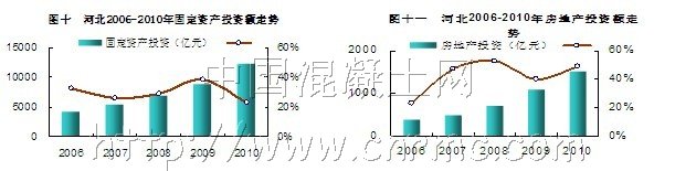 如圖十所示,河北近幾年全社會固定資產投資,穩步上升,投資結構升級調整。2010年固定資產投資達到15083.4億元,雖然受到全國資金量減少的影響,增幅較09年有所下降,但依然保持良好的增長態勢,漲幅22.5%。在固定資產投資平穩較快增長的推動下,房地產投資依舊維持其較高的增長率,河北省進入2009年后,保障性住房建設的力度空前加大,在《石家莊市住房建設與保障規劃(2008—2010年)》中省城規劃商品住房8.37萬套,建筑面積849萬平方米。由于受到保障房項目的影響,截止到2010年,全省房地產投資額為2264.83億元,較2009年上漲49%。由此也為河北的混凝土市場提供了發展機遇。