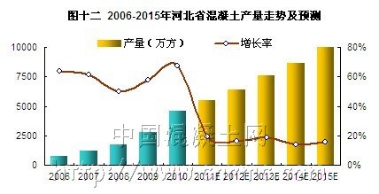 據不完全統計,河北省2010年產量為4600萬方。在全國混凝土市場的占有率達到了4%,一舉超越了福建省混凝土年產量。河北全省混凝土企業達到223家,在這223家企業中我們值得一提的是做為河北混凝土市場的“佼佼者”的河北眾誠新型建材有限公司。(圖十二:2006-2015年河北省混凝土產量走勢及預測)