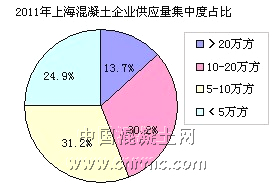 據(jù)中國混凝土網(wǎng)統(tǒng)計(jì),在2011年上半年內(nèi)上海市內(nèi)共有預(yù)拌混凝土攪拌站217個(gè),主要分布在上海的郊區(qū),上海市中心的8個(gè)區(qū)域內(nèi)混凝土攪拌站僅有15個(gè),其中個(gè)別區(qū)域如黃浦區(qū)、靜安區(qū)等均無拌站。從企業(yè)性質(zhì)來看,上海混凝土市場主要集中在民營企業(yè)中,2011上半年內(nèi),民營企業(yè)完成1193.03萬方,市場占有率51.16%;國營企業(yè)完成983.92萬方,市場占有率42.24%;合資企業(yè)完成153.6萬方,市場占有率6.6%。從各站點(diǎn)的產(chǎn)量來看,各拌站混凝土供應(yīng)量主要集中在5-20萬方,這區(qū)間內(nèi)共有拌站130個(gè),混凝土供應(yīng)量占總量的57.1%;供應(yīng)量大于20萬方的拌站共30個(gè),混凝土供應(yīng)量占混凝土總量的37.1%。