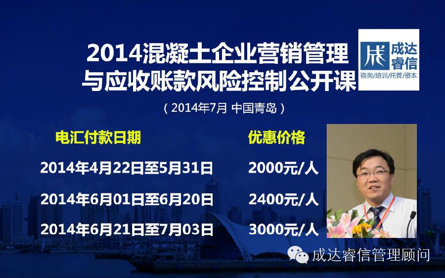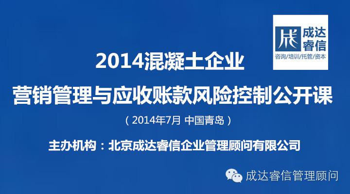 為了更加系統(tǒng)地幫助混凝土企業(yè)的高管,全面掌握強(qiáng)化營銷管理與風(fēng)險控制的規(guī)律,找到打贏2014年本企業(yè)營銷戰(zhàn)爭的思路方法,北京成達(dá)睿信管理顧問特決定于2014年7月4-5日在中國青島,舉辦《2014混凝土企業(yè)營銷管理與應(yīng)收賬款風(fēng)險控制公開課》。