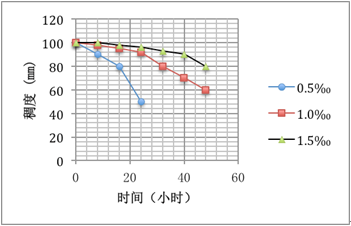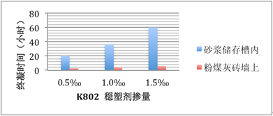 試驗結果表明(圖2.),當砂漿被存放在比較密封的砂漿槽中時,終凝時間根據穏塑劑摻量的增加可達60小時。而砂漿被抹上粉煤灰磚墻上后,即使穏塑劑摻量達1.5‰,終凝時間也只有6小時。
