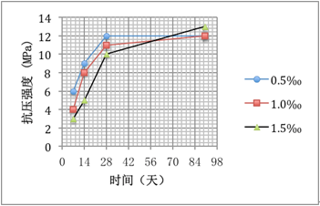 圖4.為穏塑劑摻量對商混砂漿抗壓強度的影響。添加穏塑劑后的7天早期強度一般在3~6MPa,14天強度為5~9MPa,28天為10~12MPa,90天強度基本沒有什么變化,在12~13MPa左右。穏塑劑的使用使得早期強度有所下降,但28天抗壓強度影響不大。