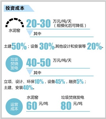 對比國內的垃圾填埋和垃圾焚燒技術,水泥窯協同處置在垃圾處置方面的環保系數更高,市場潛力大;此外,水泥窯處置垃圾的投資成本也相對較低,單位投資成本僅20萬-30萬元/噸/天,而垃圾焚燒發電則需40萬-50萬元/噸。