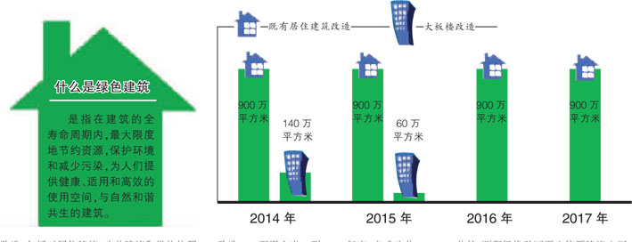 未來,天津將進一步提高建筑節能標準。新建居住建筑和公共建筑嚴格執行建筑節能強制性標準,全市新建建筑執行節能標準率達到100%。與此同時,對既有建筑加強節能改造,包括對居住建筑、公共建筑和供熱熱源及供熱系統節能改造。其中,2014年完成既有居住建筑改造900萬平方米,大板樓改造140萬平方米;2015年完成既有居住建筑改造900萬平方米,大板樓改造60萬平方米;2016年至2017年,每年完成既有居住建筑改造900萬平方米。到2015年底,完成公共建筑節能改造400萬平方米。在綠色農房建設方面,到2015年底,新建、改建綠色農房30萬平方米。《方案》還提出,要積極推行供熱計量收費。到2015年底,供熱計量收費面積超過全市集中供熱總面積的30%。