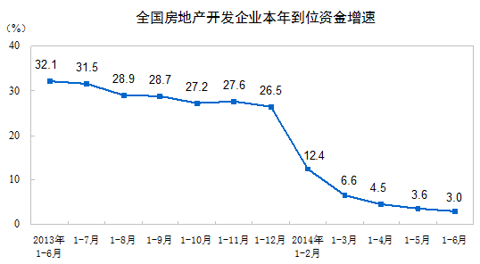1-6月份,房地產開發企業到位資金58913億元,同比增長3.0%,增速比1-5月份回落0.6個百分點。其中,國內貸款11293億元,增長14.1%;利用外資186億元,下降20.6%;自籌資金23810億元,增長10.1%;其他資金23624億元,下降7.2%。在其他資金中,定金及預收款14252億元,下降9.3%;個人按揭貸款6512億元,下降3.7%。