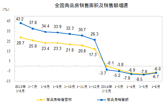 1-6月份,商品房銷售面積48365萬平方米,同比下降6.0%,降幅比1-5月份收窄1.8個百分點。其中,住宅銷售面積下降7.8%,辦公樓銷售面積下降2.8%,商業營業用房銷售面積增長7.7%。商品房銷售額31133億元,下降6.7%,降幅比1-5月份收窄1.8個百分點。其中,住宅銷售額下降9.2%,辦公樓銷售額下降12.1%,商業營業用房銷售額增長9.8%。
