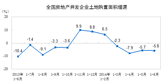 1-6月份,房地產開發企業土地購置面積14807萬平方米,同比下降5.8%,降幅比1-5月份擴大0.1個百分點;土地成交價款4031億元,增長9.0%,增速提高0.3個百分點。