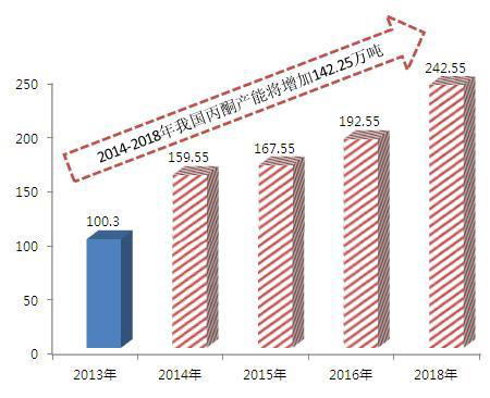 根據目前已公布的項目投產計劃,前瞻預計2014年我國丙酮行業產能將增加59.25萬噸至160萬噸,產量將達到95萬噸左右,進口量將持續減少,直至我國從凈進口國變為凈出口國,這一進程或在2018年甚至更早就來到。2015年我國丙酮產能將增加8萬噸(也有可能提前至2014年底完成),2016年將增加25萬噸,2017年及之后將增加50萬噸。