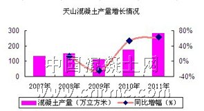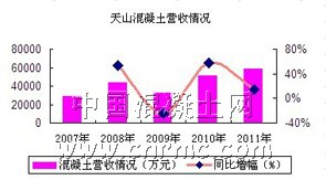 天山水泥股份有限公司地處新疆,商混產業發展迅速,所以公司近幾年決定,抓住發展機遇,將商混打造成天山水泥的第二產業。據統計,天山水泥2007年混凝土銷量為132萬立方米,營收為28518.57萬元;2011年,天山水泥的混凝土銷量已達283萬立方米,營收也達到了59041.28萬元,混凝土銷售占比為7.1%。相比于2007年都增長了100%。除此之外,天山水泥在2012年將積極發展混凝土項目,已將商混的銷量目標定為307萬立方米,并且據最新消息,天山股份擬2.08億元投建四個混凝土項目,這將標志著天山股份在混凝土行業中將更上一層樓。