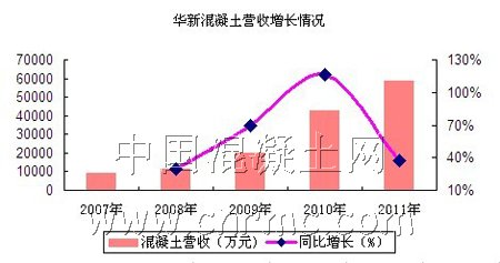 華新水泥自從2002年建成投產,2005年建成混凝土分公司,到目前,華新旗下擁有四個現代化混凝土公司。公司配備有8條180混凝土生產線,220部攪拌運輸車,日最大生產供貨能力可達5萬立方混凝土。在如此規模下,向混凝土行業進軍已是順勢而為。同時,2008年華新水泥的銷量僅只有58萬立方米,營收為11644萬元,混凝土銷售占比為1.83%;2011年,華新水泥的銷量已達到500萬立方米,營收為58411.75萬元,混凝土銷售占比為4.62%。憑這優異成績,公司一直是湖北省混凝土市場的龍頭。