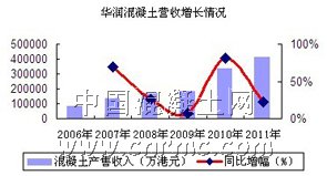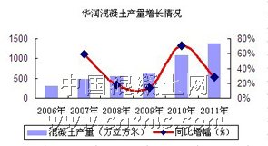 華潤水泥控股有限公司是華潤集團旗下主營水泥與混凝土業務的公司,其公司的業務范圍已粵、桂、閩、瓊、晉、滇、黔、蒙、黑龍江東部、陜北及港澳等十多個地區。數據顯示,2008年,華潤水泥混凝土銷量為555萬立方米,營業額為17.13億港元。到了2011年,華潤水泥混凝土銷量為1383萬立方米,營業額為49.43億港元,相比于2008年分別增長了250%和288%,混凝土銷售占比達到了17.66%。此外,截止2011年,華潤水泥的攪拌站數已超過50個,年產能更是達到3200萬立方米,位居我國混凝土企業榜首。