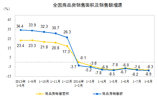 1-8月份,商品房銷售面積64987萬平方米,同比下降8.3%,降幅比1-7月份擴大0.7個百分點。其中,住宅銷售面積下降10.0%,辦公樓銷售面積下降8.9%,商業營業用房銷售面積增長6.4%。商品房銷售額41661億元,下降8.9%,降幅比1-7月份擴大0.7個百分點。其中,住宅銷售額下降10.9%,辦公樓銷售額下降19.5%,商業營業用房銷售額增長7.5%。